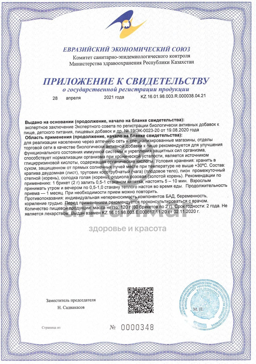 В его состав включены лучшие алтайские травы. Золотой корень активизирует адаптационные механизмы гипоталамо-гипофизарной системы, солодка - коры надпочечников. Крапива улучшает показатели крови, содержит максимальное для местной флоры количество хлорофилла - вещества близкого по химическому составу к гемоглобину. Чага, за счет выраженного общеукрепляющего действия, способствует улучшению состояния онкологических больных. Пион оказывает выраженное антистрессовое действие, стабилизирует нервную систему, оптимизируя действие сбора.