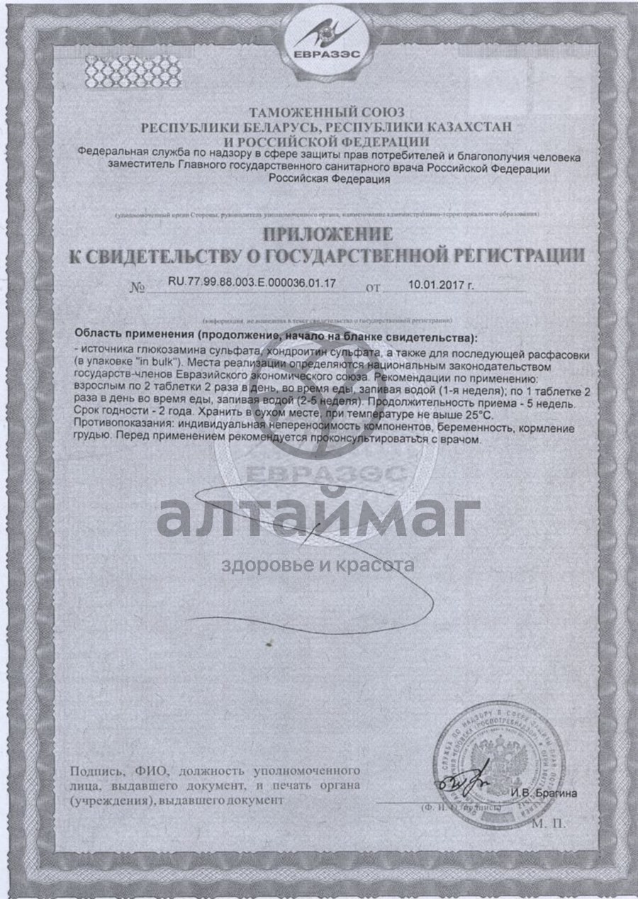 Источник глюкозамин сульфата, хондроитин сульфата. Способствует: улучшению питания суставного хряща, улучшению выработки и состава внутрисуставной жидкости, улучшению смазки суставов. Ускорению процессов восстановления суставного хряща, предотвращению разрушения хрящевой ткани. Улучшению подвижности и функций суставов.