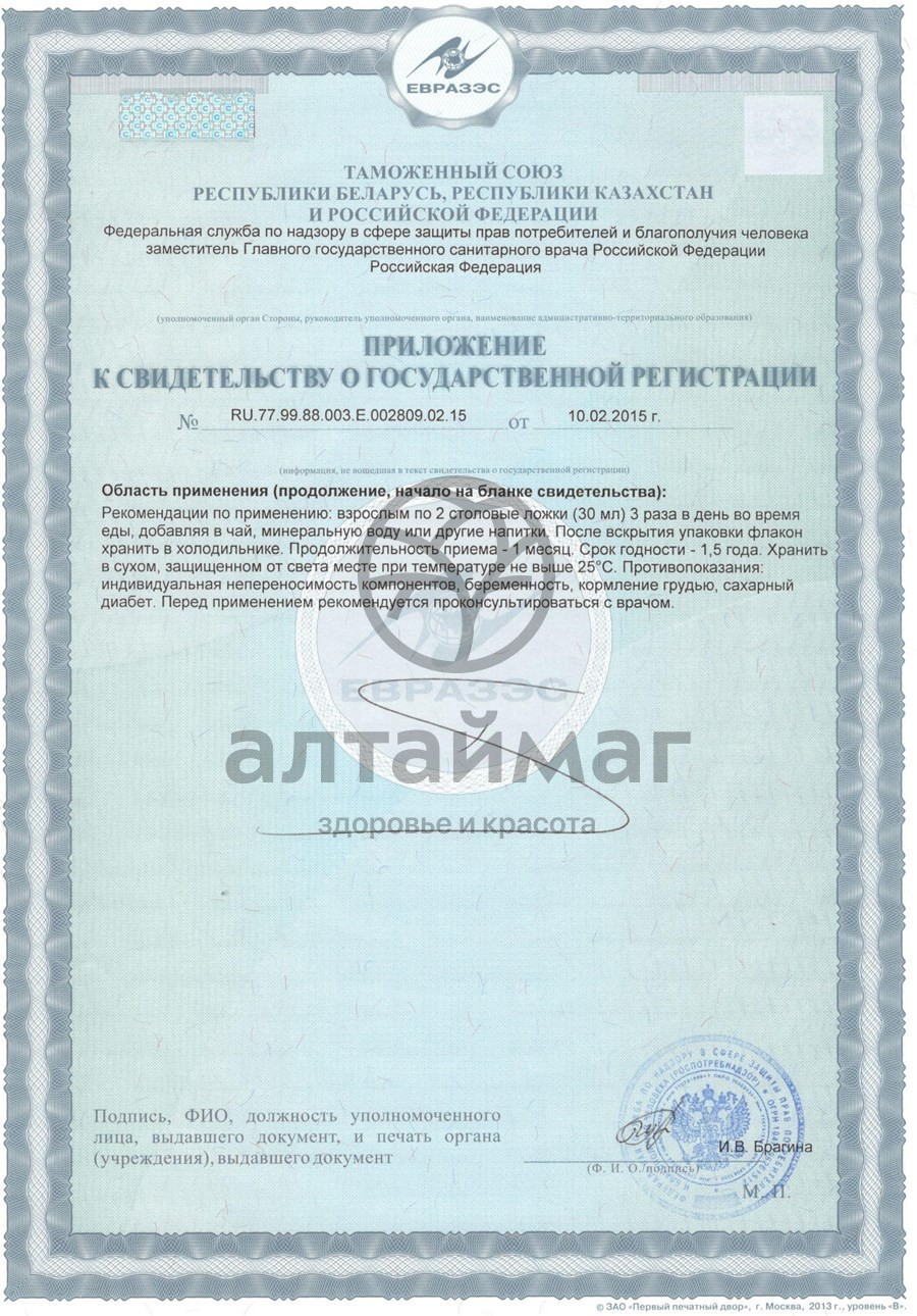 экстракты лекарственных трав (золотой корень, красный корень, левзея, лабазник) натуральный сок, мёд, мумиё, колер, лимонная кислота, ванилин, сахарный сироп.