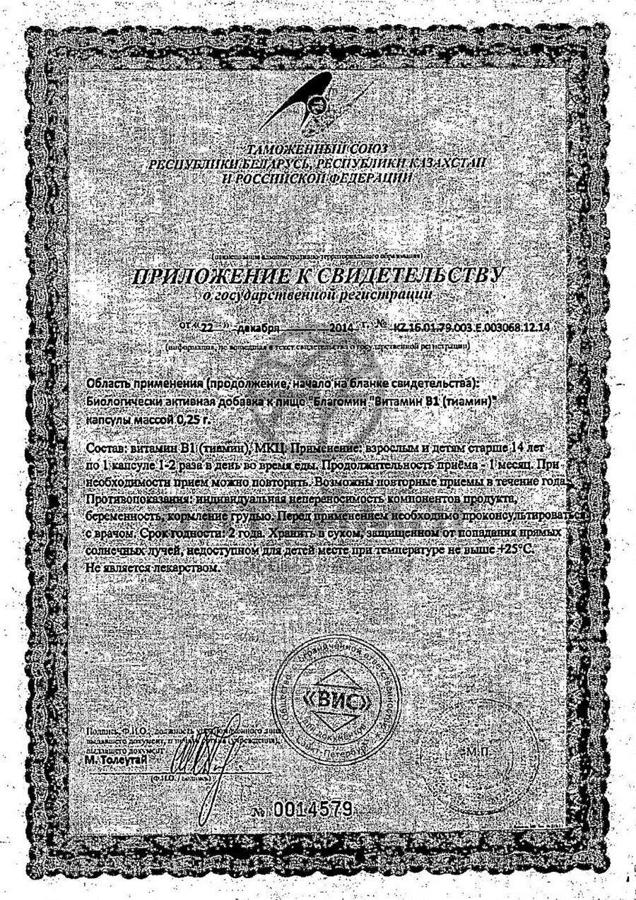 «Благомин» Витамин В1 (тиамин) рекомендуется В качестве биологически активной добавки к пище – дополнительного источника витамина В1.