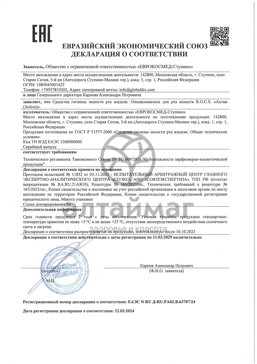 R.O.C.S. АКТИВ - обладает антисептическим действием, подавляет рост бактерий, ухаживает за деснами.
