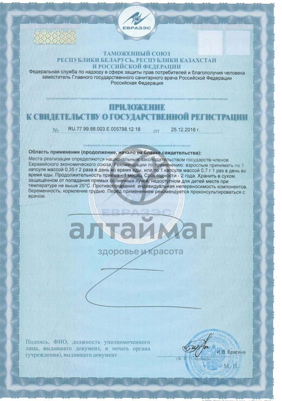 Взрослым принимать по 1 капсуле массой 0,35 г 2 раза в день во время еды. Продолжительность приема 1 месяц. Перед применением рекомендуется проконсультироваться с врачом.Состав: