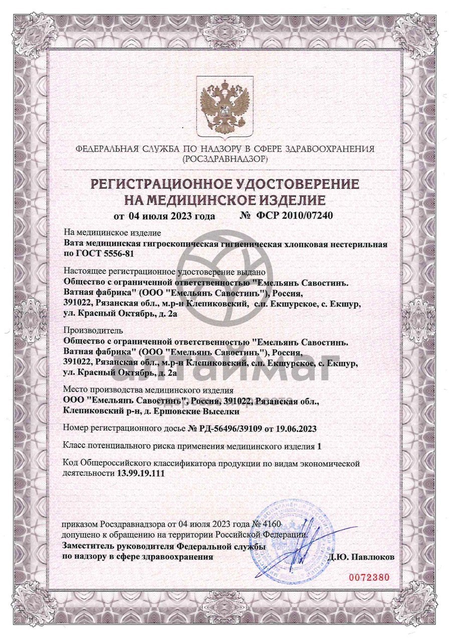 Вата медицинская гигроскопическая гигиеническая хлопковая нестерильная по ГОСТ 5556-81. Предназначена для изготовления сорбционных перевязочных средств: ватно-марлевых повязок, шариков, тампонов, в гигиенических целях.